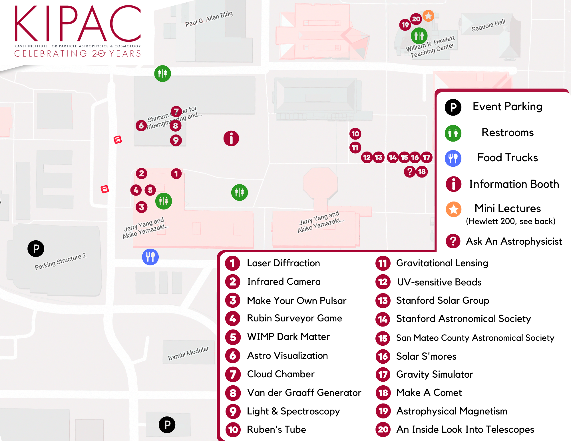This event will take place in the Science & Engineering Quad courtyards and the Hewlett Teaching Center (370 Jane Stanford Way) on the Stanford campus. If you have registered, please check in at the information booth upon arrival to receive your KIPAC giveaways.