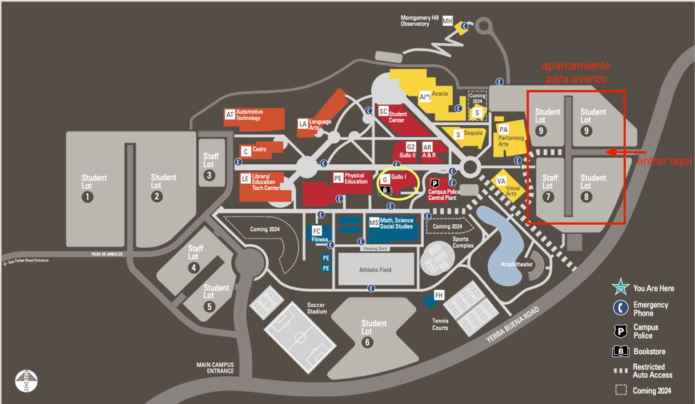 El evento presencial tendrá lugar en el Gullo II del Evergreen Valley College (3095 Yerba Buena Rd, San Jose, CA 95135). Si planean ir en coche, por favor aparcar en el lote 7, 8 o 9 de Yerba Buena Rd entre Montgomery Hill Trail y Vella Del Lago (ver mapa adjunto; lotes marcados con un recuadro rojo) y sigue las indicaciones a Gullo II (marcado con un círculo amarillo). El aparcamiento es gratuito. Las puertas se abrirán a las 3:20pm.