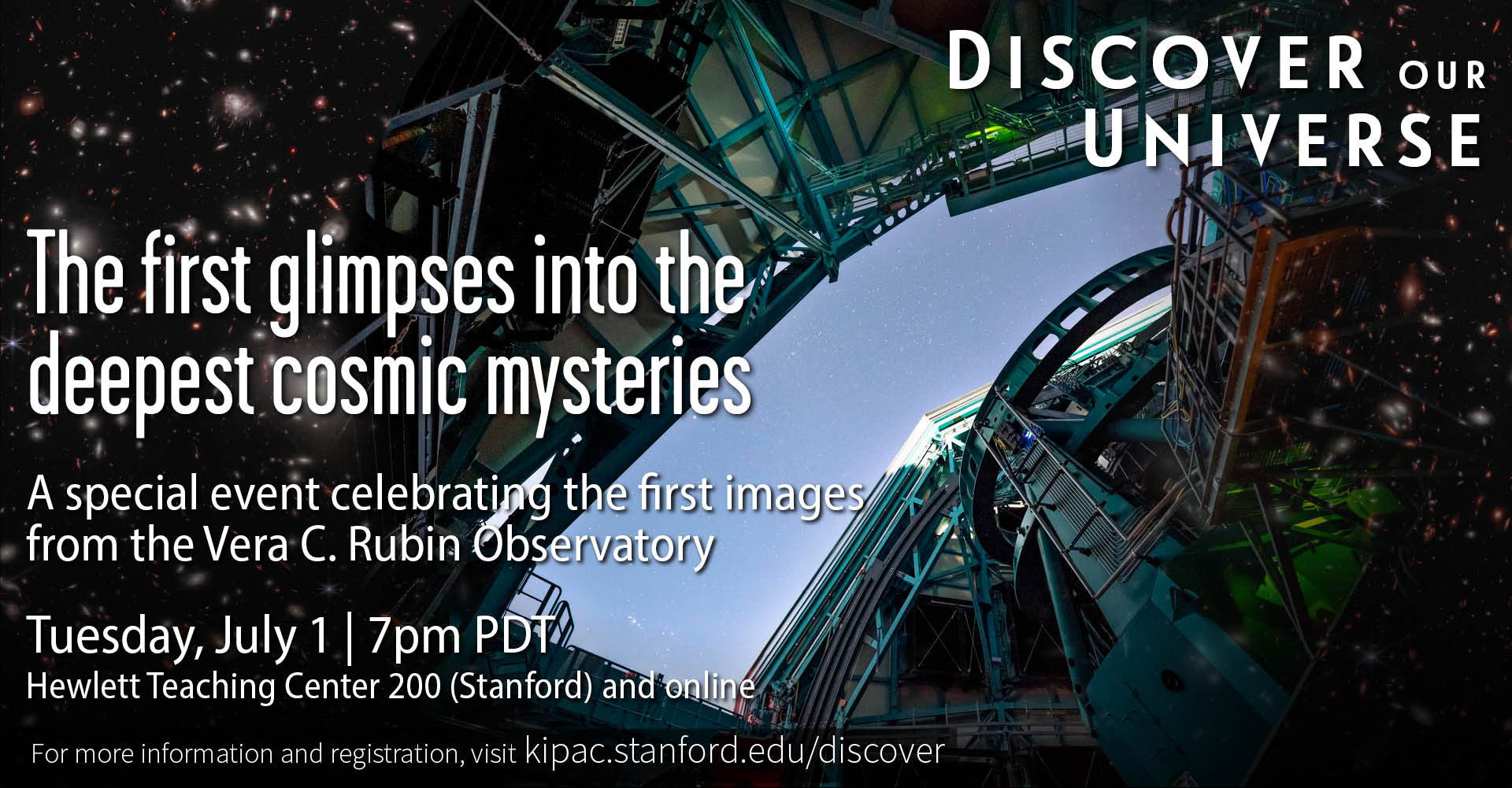 Join us for a special public event in celebration of Rubin’s First Look, where we’ll explore Rubin’s newly released first images and the groundbreaking science they enable. Aaron Roodman will open the evening with an introduction to the observatory, featuring the world’s largest digital camera, and will lead a tour through these first images. Then, we’ll dive into three key areas of discovery: Risa Wechsler will explain how Rubin’s maps of billions of galaxies will allow us to trace the invisible scaffolding of dark matter and shed light on the nature of dark energy; Shreya Anand will highlight Rubin’s unprecedented ability to capture the dynamic, transient universe — from exploding stars to moving asteroids; and Christian Aganze will explore how Rubin’s census of tens of billions of stars will reveal the structure and history of our own Milky Way, including new insight into the faintest stars. We will end the evening with a live panel Q&A to discuss how Rubin will help decode the past, present, and future of our universe and our place in it.