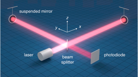 Figure 1. Sketch of a laser interferometer used to detect gravitational waves on Earth. A laser beam is split into two, and sent along two diverging paths before being reflected and recombined. The minutest changes in distance between the two paths (caused by a gravitational wave) cause the two beams to become out of phase with each other and destructively interfere. (Credit:  Pierre Fleury.)