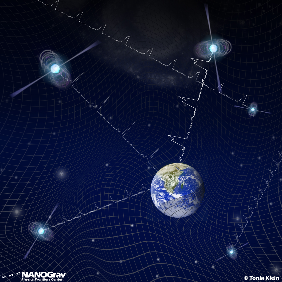 Pulsars are rapidly rotating neutron stars that emit pulses of radio light at a fixed rate. Because of the regularity of their bursts, we can use them like clocks. By measuring the subtle differences in the rate of each clock over time, we can tell that a gravitational wave is passing by. By utilizing many of these pulsar-clocks scattered throughout the galaxy, we can create a pulsar timing array, turning the Milky Way into one enormous telescope (see Fig. 2). In 2023, several independent collaborations used pulsar timing arrays to obtain concrete evidence of the existence of a background hum of ultra-long wavelength gravitational waves (Scientists find key evidence for existence of nanohertz gravitational waves).