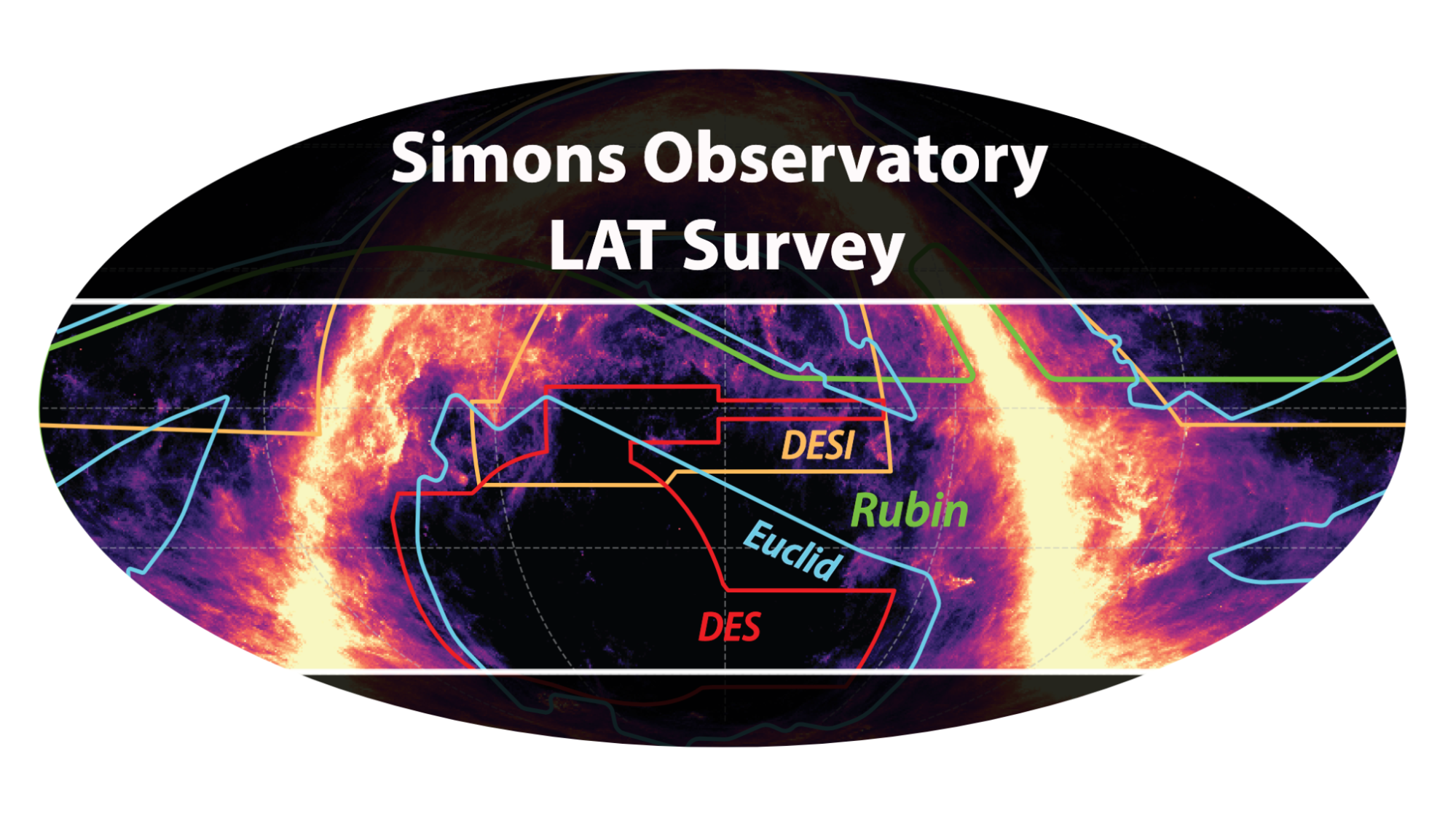 And the Simons Observatory won't be doing this in isolation. The LAT survey footprint covers about 60% of the sky, overlapping significantly with complimentary galaxy surveys like the Rubin Observatory Legacy Survey of Space and Time (Rubin) and the Dark Energy Spectroscopic Instrument (DESI). Some of our most ambitious science goals, including constraints on neutrino masses and tests of dark energy, wouldn't be possible without these cross-correlations with Rubin and DESI.