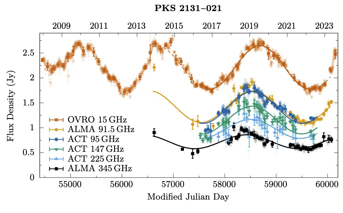Multi-wavelength light curves of a strong SMBHB candidate reveal the unique sinusoidal signature of the binary system across many years of observation. (Image credit: Hincks et al. 2025.)