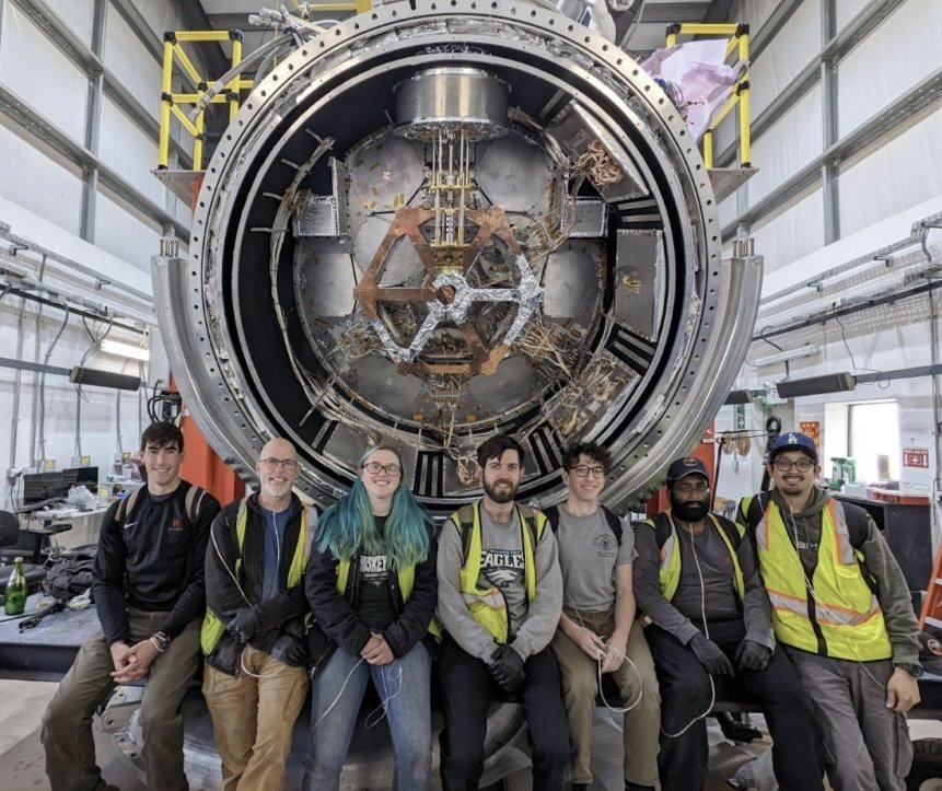 KIPAC members Toby Satterthwaite (far left) and Carlos Sierra (far right) with the Simons Observatory LAT receiver integration team. The recent upgrade has doubled the number of optics tubes (and detectors) shown here. (Image credit: Simons Observatory.)