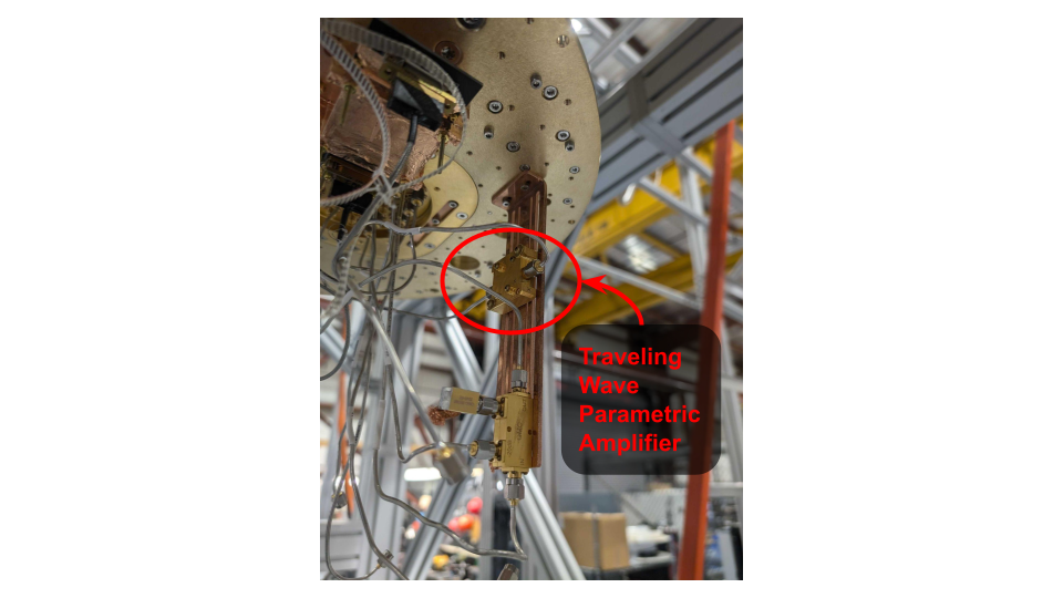 The resonator is the core of a haloscope, but there are many other tricks to play to make the axion signal easier to detect. For one, you can make the haloscope colder, so it glows less (all objects glow, but in our daily lives, this glow is mostly in the infrared, so we don’t see it). The detector will be cooled to below 0.2 °F above absolute zero, or about 4 °F colder than space. Since our system will be cold anyway, we can also use a “traveling wave parametric amplifier” shown in Figure 3. These superconducting devices can amplify the signal while adding the least amount of background noise allowed by the Heisenberg uncertainty principle.