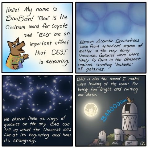 Besides doing great science, DESI scientists are also encouraged to do scientific outreach. We even have an official ambassador called BaoBan! BaoBan is a coyote who assists us with science communications. “Bao” is reminiscent of baryon acoustic oscillations (BAO), while “Ban” is the word for coyote in the official language used by the Tohono O’odham Nation. If you are lucky enough, you could hear BaoBan in the middle of the night at the top of the mountain at Kitt Peak National Observatory while looking at the data from millions of galaxies.